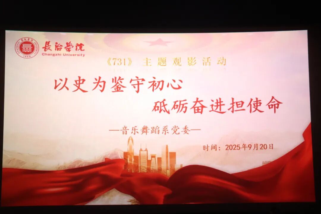 为深刻铭记历史、传承红色基因,进一步筑牢党员理想信念根基,9月20日下午,音乐舞蹈系党委组织全体师生党员开展主题党日活动,集中观看历史题材电影《731》,在光影叙事中重温历史真相,凝聚奋进力量。