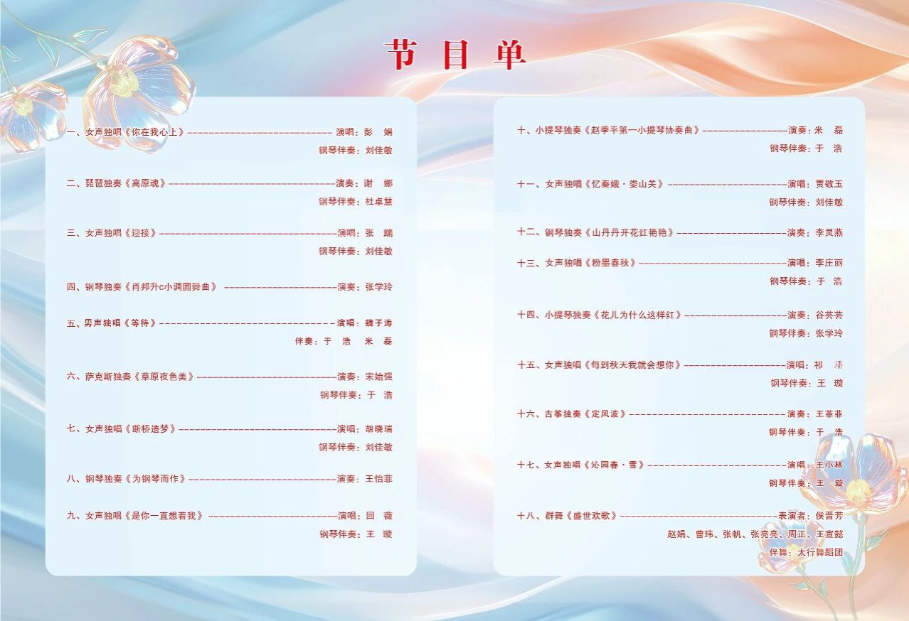 金秋送爽,叶舞翩跹。10月17日,长治学院音乐舞蹈系“2025教师专业汇报音乐会”在长治学院实验剧场隆重举行,标志着长治学院音乐舞蹈系第四届校园艺术实践周系列活动正式拉开帷幕。节目单音乐会伊始,校领导莅临现场,与师生共同观看了演出。本次汇报音乐会旨在深入贯彻落实党的二十大精神,积极践行“办好人民满意的教育”的指导思想,全面展现“活力长院”的蓬勃朝气。活动通过音乐舞蹈的艺术形式,生动彰显了音乐舞蹈系的办学特色与师资队伍的专业素养,集中呈现了该系教师扎实的专业能力与昂扬的精神风貌,为学校建设具有区域代表性的高水平应用型本科院校注入了文化动能。器乐组琵琶独奏《高原魂》钢琴独奏《肖邦升c小调圆舞曲》萨克斯独奏《草原夜色美》钢琴独奏《为钢琴而作》小提琴独奏《赵季平第一小提琴协奏曲》钢琴独奏《山丹丹开花红艳艳》小提琴独奏《花儿为什么这样红》古筝独奏《定风波》声乐组独唱《你在我心上》独唱《迎接》独唱《断桥遗梦》独唱《是你一直想着我》独唱《忆秦娥·娄山关》独唱《粉墨春秋》独唱《每到秋天我就会想你》独唱《沁园春·雪》独唱《等待》舞蹈组群舞《盛世欢歌》整场演出节目内容丰富、编排精心,凝聚了全体参演教师的智慧与汗水。他们以精湛的技艺和饱满的热情,为现场观众带来了一场高水平的艺术盛宴,充分体现了音乐舞蹈系在教育教学与实践方面的丰硕成果,此次教师专业汇报音乐会的成功举办,不仅为校园文化生活增添了浓墨重彩的一笔,也进一步推动了艺术教育与人才培养的深度融合。