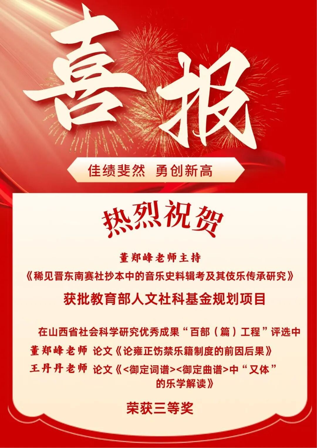 热烈祝贺董郑峰老师主持《稀见晋东南赛社抄本中的音乐史料辑考及其伎乐传承研究》获批教育部人文社科基金规划项目。同时,在山西省社会科学研究优秀成果“百部(篇)工程”评选中董郑峰老师论文《论雍正饬禁乐籍制度的前因后果》王丹丹老师论文《<御定词谱><御定曲谱>中“又体”的乐学解读》荣获三等奖。